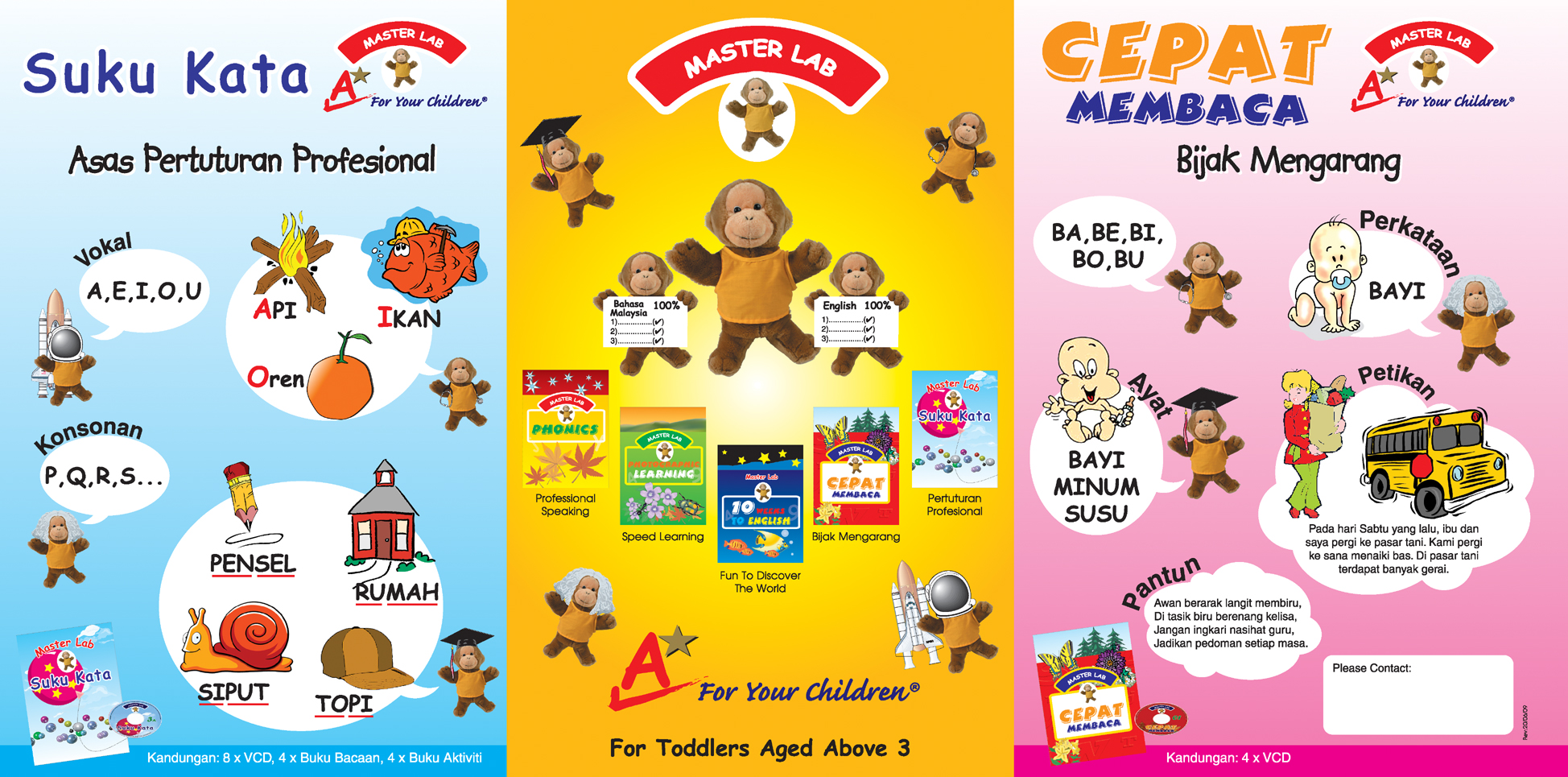 In each lesson the child will be introduced to a letter or sound and the pronunciation in the VCD. After learning the vowels and consonants, the child begins to blend letters to form words. The child then, proceeds to reading simple reader’s books and practice doing the activities given in the Activity books.